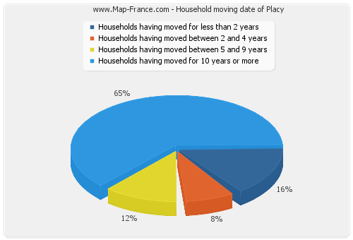 - Number of households of Placy having moved between 2 and 5 years : 4 - Number of households of Placy having moved between 5 and 9 years : 6 - Number of households of Placy having moved for 10 years or more : 33 |