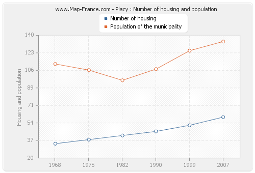 The population of Placy was 134 inhabitants in 2007, 125 inhabitants in 1999, 107 inhabitants in 1990, 96 inhabitants in 1982, 106 inhabitants in 1975 and 112 inhabitants in 1968. Meanwhile, the number of housing of Placy was 60 in 2007, 52 in 1999, 46 in 1990, 42 in 1982, 38 in 1975 and 34 in 1968.