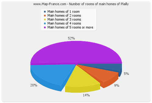 - Number of main homes of Plailly of 1 room : 34 - Number of main homes of Plailly of 2 rooms : 57 - Number of main homes of Plailly of 3 rooms : 87 - Number of main homes of Plailly of 4 rooms : 87 - Number of main homes of Plailly of 5 rooms and more : 331 |