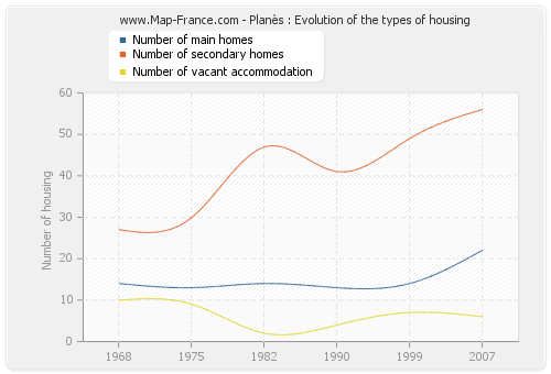 The number of housing of Planès was 83 in 2007, 70 in 1999, 58 in 1990, 63 in 1982, 52 in 1975 and 51 in 1968.