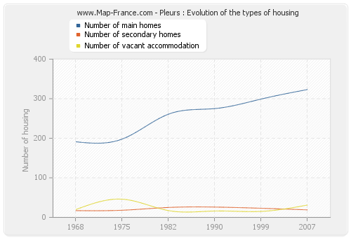 The following graphs show the history of the number and the type of housing of Pleurs from 1968 to 2007. The second graph is drawn in cubic interpolation. This allows to obtain more exactly the number of accommodation of the town of Pleurs years where no inventory was made.