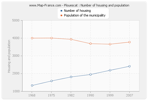 The population of Plouescat was 3 778 inhabitants in 2007, 3 660 inhabitants in 1999, 3 689 inhabitants in 1990, 3 935 inhabitants in 1982, 4 008 inhabitants in 1975 and 4 003 inhabitants in 1968. Meanwhile, the number of housing of Plouescat was 2 414 in 2007, 2 186 in 1999, 1 949 in 1990, 1 811 in 1982, 1 586 in 1975 and 1 329 in 1968.