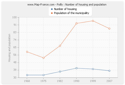 The population of Poilly was 87 inhabitants in 2007, 96 inhabitants in 1999, 93 inhabitants in 1990, 67 inhabitants in 1982, 53 inhabitants in 1975 and 60 inhabitants in 1968. Meanwhile, the number of housing of Poilly was 38 in 2007, 40 in 1999, 41 in 1990, 37 in 1982, 33 in 1975 and 33 in 1968.
