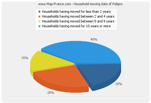 - Number of households of Poligny having moved between 2 and 5 years : 5 - Number of households of Poligny having moved between 5 and 9 years : 3 - Number of households of Poligny having moved for 10 years or more : 8 |