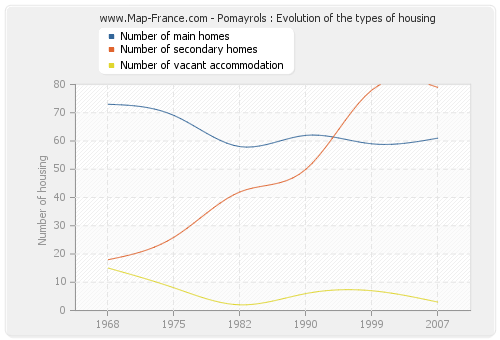 The following graphs show the history of the number and the type of housing of Pomayrols from 1968 to 2007. The second graph is drawn in cubic interpolation. This allows to obtain more exactly the number of accommodation of the town of Pomayrols years where no inventory was made.