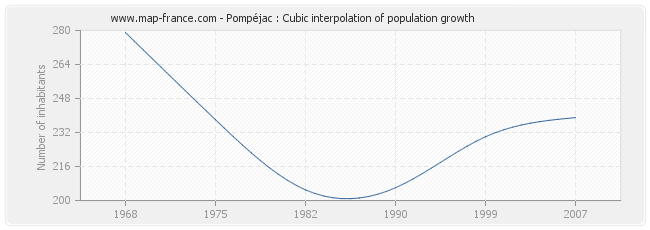 This curve shows the history of the population of Pompéjac from 1968 to 2007 in cubic interpolation. This provides more precisely the population of the municipality of Pompéjac the years where no census has been taken.