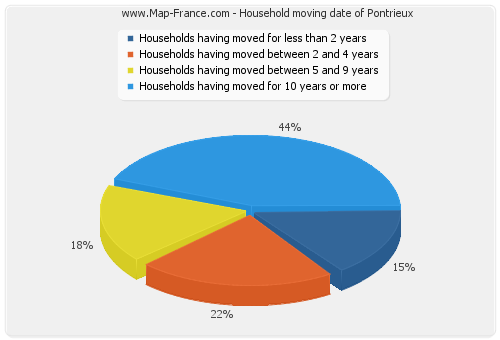 - Number of households of Pontrieux having moved between 2 and 5 years : 129 - Number of households of Pontrieux having moved between 5 and 9 years : 102 - Number of households of Pontrieux having moved for 10 years or more : 256 |