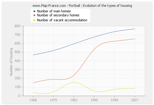 In 2007 the accommodations of Portbail consisted of 768 main homes, 654 second homes and 83 vacant accommodations.