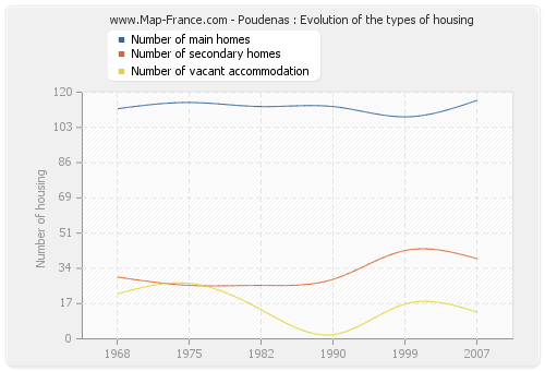 The number of housing of Poudenas was 168 in 2007, 168 in 1999, 144 in 1990, 153 in 1982, 168 in 1975 and 164 in 1968.