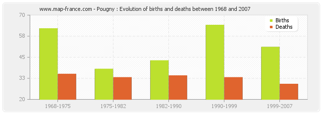 Population of Pougny was 747 inhabitants in 2007, 628 inhabitants in 1999, 600 inhabitants in 1990, 543 inhabitants in 1982, 543 inhabitants in 1975 and 424 inhabitants in 1968.