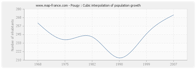 This curve shows the history of the population of Pougy from 1968 to 2007 in cubic interpolation. This provides more precisely the population of the municipality of Pougy the years where no census has been taken.