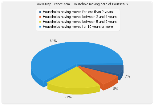- Number of households of Pousseaux having moved between 2 and 5 years : 7 - Number of households of Pousseaux having moved between 5 and 9 years : 18 - Number of households of Pousseaux having moved for 10 years or more : 56 |