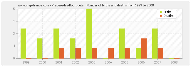 Pradère-les-Bourguets : births and deaths from 1999 to 2008
