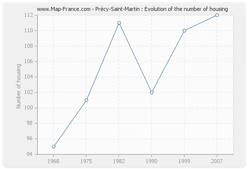 The number of housing of Précy-Saint-Martin was 112 in 2007, 110 in 1999, 102 in 1990, 111 in 1982, 101 in 1975 and 95 in 1968.