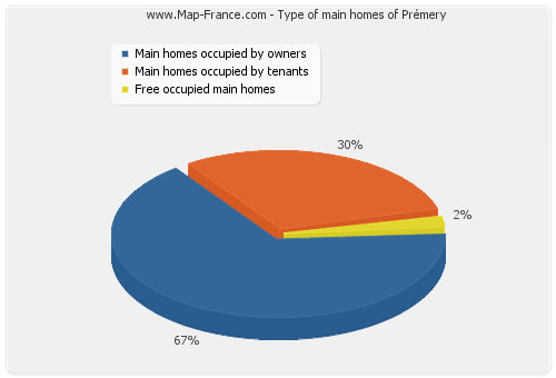 - Number of main homes of Prémery occupied by owners : 680 - Number of main homes of Prémery occupied by tenants : 307 - Number of main homes of Prémery occupied free of charge : 23 |