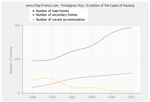 The number of housing of Pressignac-Vicq was 261 in 2007, 238 in 1999, 206 in 1990, 182 in 1982, 170 in 1975 and 152 in 1968.