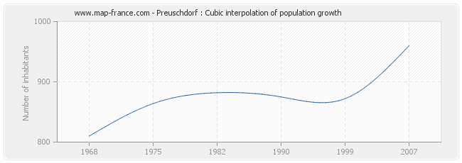 This curve shows the history of the population of Preuschdorf from 1968 to 2007 in cubic interpolation. This provides more precisely the population of the municipality of Preuschdorf the years where no census has been taken.