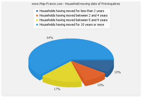 - Number of households of Prévinquières having moved between 2 and 5 years : 11 - Number of households of Prévinquières having moved between 5 and 9 years : 19 - Number of households of Prévinquières having moved for 10 years or more : 74 |