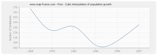 This curve shows the history of the population of Prez from 1968 to 2007 in cubic interpolation. This provides more precisely the population of the municipality of Prez the years where no census has been taken.