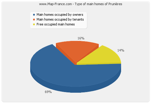 - Number of main homes of Prunières occupied by owners : 106 - Number of main homes of Prunières occupied by tenants : 25 - Number of main homes of Prunières occupied free of charge : 22 |