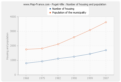 The population of Puget-Ville was 3 628 inhabitants in 2007, 3 084 inhabitants in 1999, 2 591 inhabitants in 1990, 2 115 inhabitants in 1982, 1 819 inhabitants in 1975 and 1 755 inhabitants in 1968. Meanwhile, the number of housing of Puget-Ville was 1 703 in 2007, 1 442 in 1999, 1 256 in 1990, 1 119 in 1982, 933 in 1975 and 804 in 1968.