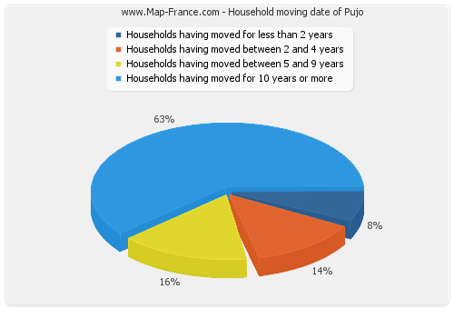 - Number of households of Pujo having moved between 2 and 5 years : 32 - Number of households of Pujo having moved between 5 and 9 years : 38 - Number of households of Pujo having moved for 10 years or more : 149 |
