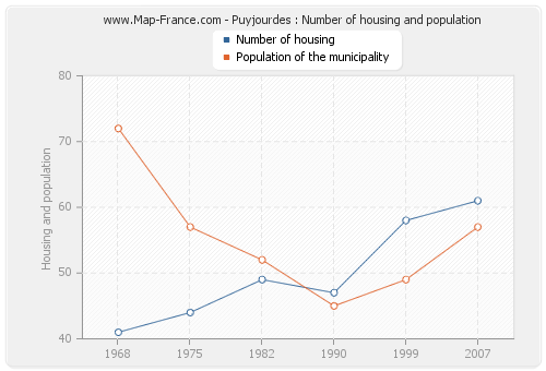 The population of Puyjourdes was 57 inhabitants in 2007, 49 inhabitants in 1999, 45 inhabitants in 1990, 52 inhabitants in 1982, 57 inhabitants in 1975 and 72 inhabitants in 1968. Meanwhile, the number of housing of Puyjourdes was 61 in 2007, 58 in 1999, 47 in 1990, 49 in 1982, 44 in 1975 and 41 in 1968.