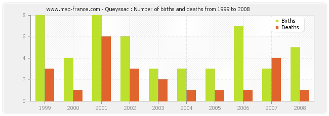Queyssac : evolution of births and deaths from 1968 to 2007
