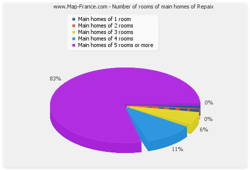 - Number of main homes of Repaix of 1 room : 0 - Number of main homes of Repaix of 2 rooms : 0 - Number of main homes of Repaix of 3 rooms : 2 - Number of main homes of Repaix of 4 rooms : 2 - Number of main homes of Repaix of 5 rooms and more : 30 |