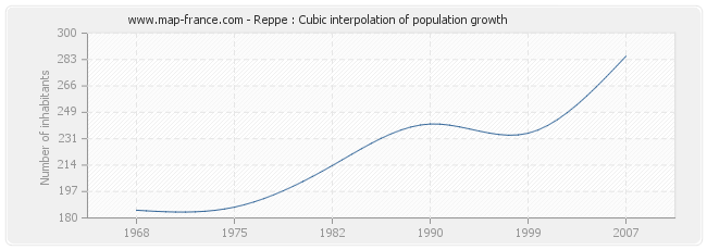 This curve shows the history of the population of Reppe from 1968 to 2007 in cubic interpolation. This provides more precisely the population of the municipality of Reppe the years where no census has been taken.