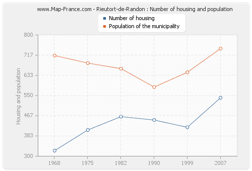 The population of Rieutort-de-Randon was 744 inhabitants in 2007, 646 inhabitants in 1999, 585 inhabitants in 1990, 661 inhabitants in 1982, 684 inhabitants in 1975 and 715 inhabitants in 1968. Meanwhile, the number of housing of Rieutort-de-Randon was 541 in 2007, 419 in 1999, 449 in 1990, 463 in 1982, 408 in 1975 and 323 in 1968.