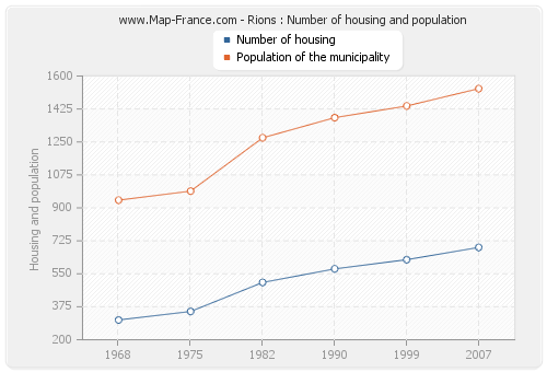 The population of Rions was 1 533 inhabitants in 2007, 1 441 inhabitants in 1999, 1 379 inhabitants in 1990, 1 272 inhabitants in 1982, 989 inhabitants in 1975 and 941 inhabitants in 1968. Meanwhile, the number of housing of Rions was 690 in 2007, 625 in 1999, 576 in 1990, 504 in 1982, 350 in 1975 and 305 in 1968.