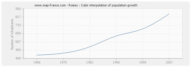 Population of Roisey was 850 inhabitants in 2007, 698 inhabitants in 1999, 626 inhabitants in 1990, 517 inhabitants in 1982, 453 inhabitants in 1975 and 433 inhabitants in 1968.