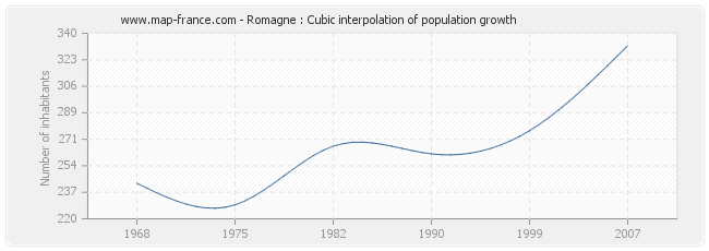 This curve shows the history of the population of Romagne from 1968 to 2007 in cubic interpolation. This provides more precisely the population of the municipality of Romagne the years where no census has been taken.