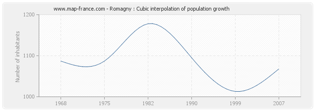 This curve shows the history of the population of Romagny from 1968 to 2007 in cubic interpolation. This provides more precisely the population of the municipality of Romagny the years where no census has been taken.