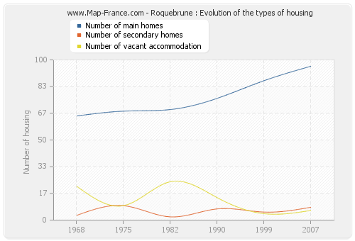 The number of housing of Roquebrune was 110 in 2007, 96 in 1999, 97 in 1990, 95 in 1982, 86 in 1975 and 89 in 1968.
