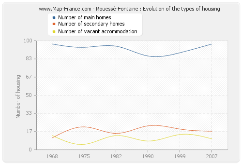 The following graphs show the history of the number and the type of housing of Rouessé-Fontaine from 1968 to 2007. The second graph is drawn in cubic interpolation. This allows to obtain more exactly the number of accommodation of the town of Rouessé-Fontaine years where no inventory was made.