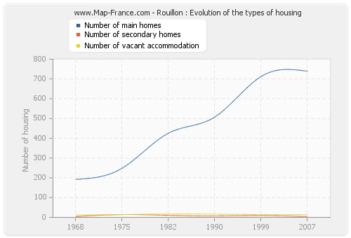 The following graphs show the history of the number and the type of housing of Rouillon from 1968 to 2007. The second graph is drawn in cubic interpolation. This allows to obtain more exactly the number of accommodation of the city of Rouillon years where no inventory was made.