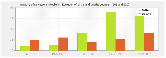 Roullens : evolution of births and deaths from 1968 to 2007