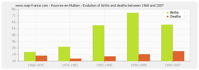 Rouvres-en-Multien : evolution of births and deaths from 1968 to 2007