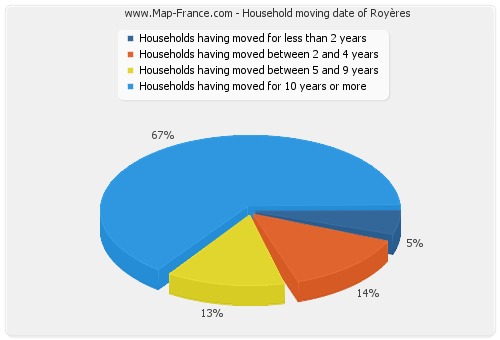 - Number of households of Royères having moved between 2 and 5 years : 49 - Number of households of Royères having moved between 5 and 9 years : 47 - Number of households of Royères having moved for 10 years or more : 234 |