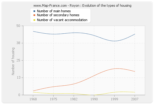 In 2007 the accommodations of Royon consisted of 44 main homes, 17 second homes and 2 vacant accommodations.