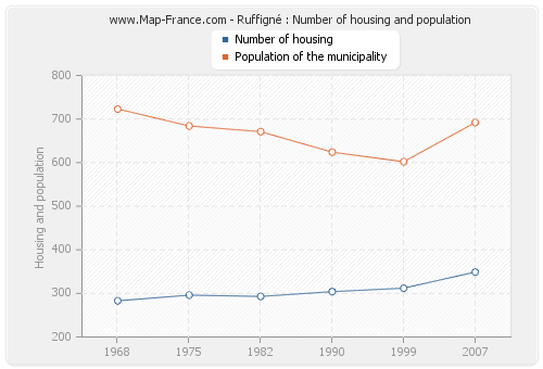 The population of Ruffigné was 692 inhabitants in 2007, 602 inhabitants in 1999, 624 inhabitants in 1990, 671 inhabitants in 1982, 684 inhabitants in 1975 and 723 inhabitants in 1968. Meanwhile, the number of housing of Ruffigné was 349 in 2007, 312 in 1999, 304 in 1990, 293 in 1982, 296 in 1975 and 283 in 1968.