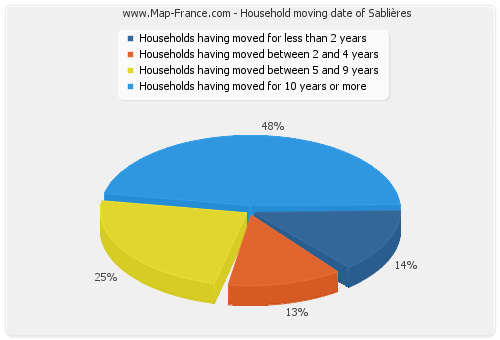- Number of households of Sablières having moved between 2 and 5 years : 9 - Number of households of Sablières having moved between 5 and 9 years : 17 - Number of households of Sablières having moved for 10 years or more : 33 |
