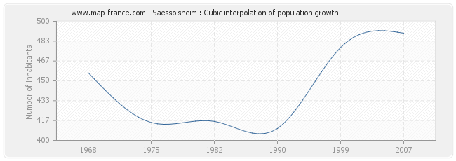 This curve shows the history of the population of Saessolsheim from 1968 to 2007 in cubic interpolation. This provides more precisely the population of the municipality of Saessolsheim the years where no census has been taken.