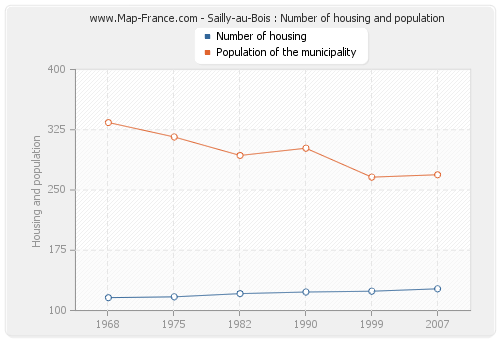 The population of Sailly-au-Bois was 269 inhabitants in 2007, 266 inhabitants in 1999, 302 inhabitants in 1990, 293 inhabitants in 1982, 316 inhabitants in 1975 and 334 inhabitants in 1968. Meanwhile, the number of housing of Sailly-au-Bois was 127 in 2007, 124 in 1999, 123 in 1990, 121 in 1982, 117 in 1975 and 116 in 1968.