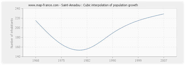 This curve shows the history of the population of Saint-Amadou from 1968 to 2007 in cubic interpolation. This provides more precisely the population of the municipality of Saint-Amadou the years where no census has been taken.