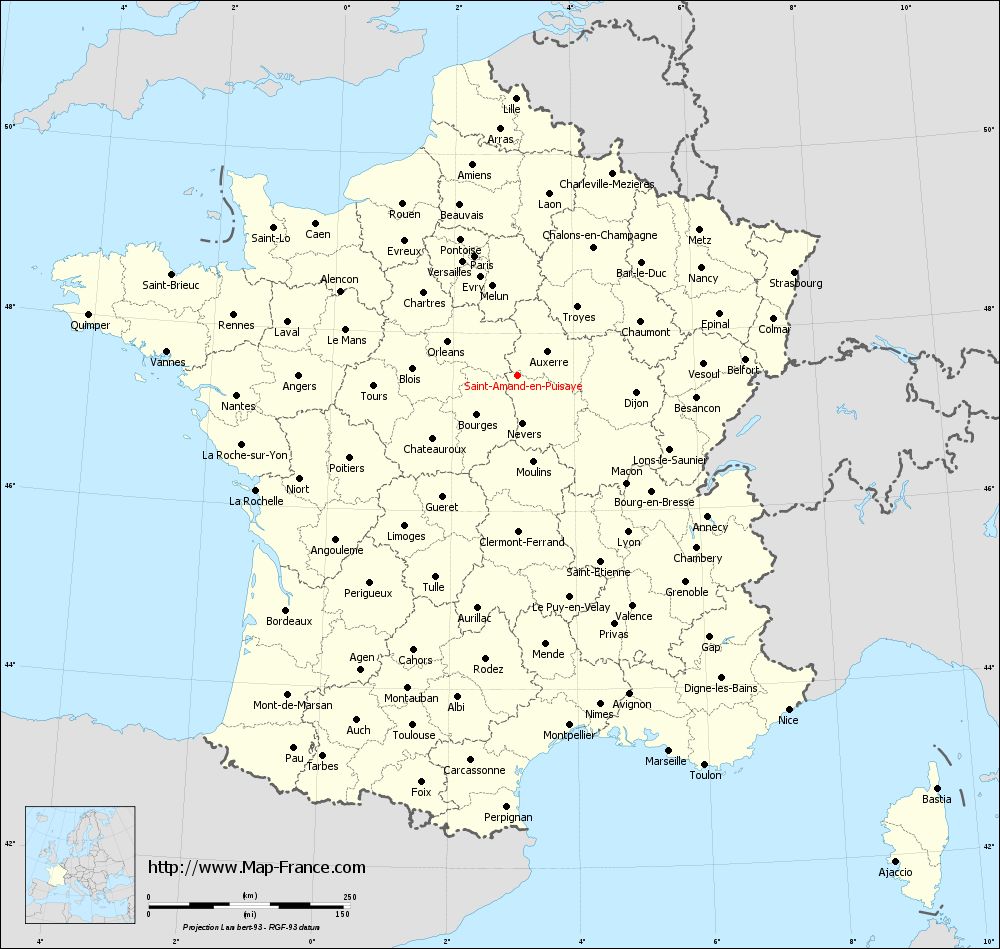 Map of Saint-Amand-en-Puisaye with departments and prefectures