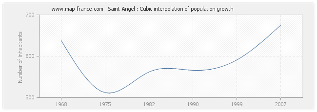 This curve shows the history of the population of Saint-Angel from 1968 to 2007 in cubic interpolation. This provides more precisely the population of the municipality of Saint-Angel the years where no census has been taken.
