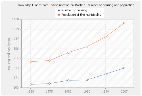 The population of Saint-Antoine-du-Rocher was 1 341 inhabitants in 2007, 1 095 inhabitants in 1999, 924 inhabitants in 1990, 818 inhabitants in 1982, 679 inhabitants in 1975 and 660 inhabitants in 1968. Meanwhile, the number of housing of Saint-Antoine-du-Rocher was 547 in 2007, 440 in 1999, 337 in 1990, 328 in 1982, 273 in 1975 and 257 in 1968.